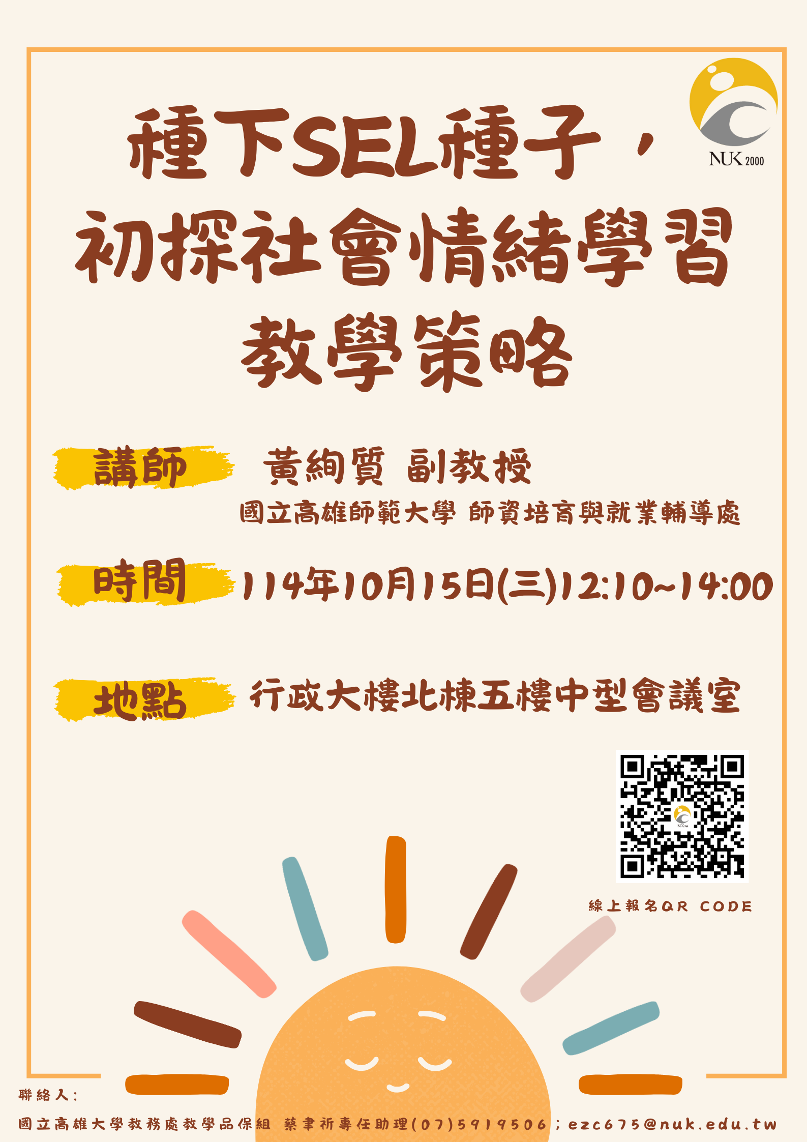 國立高雄大學於114年10月15日、27日辦理2場教學實踐研究與社會情緒學習系列研習,邀請本校教師踴躍報名參加!
