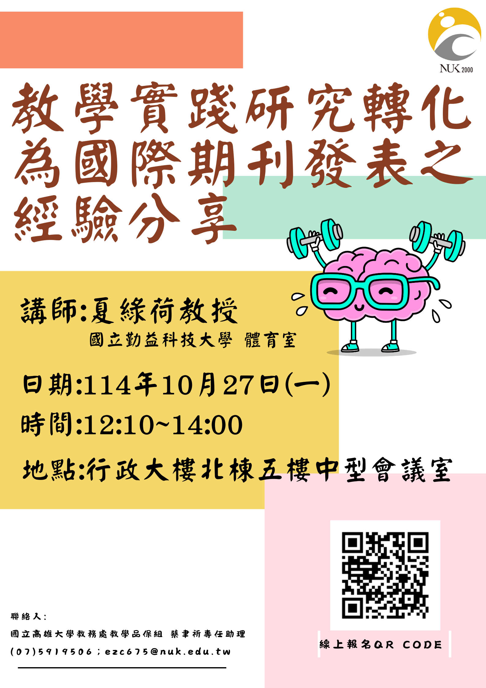 1、主題:《教學實踐研究轉化為國際期刊發表之經驗分享》。